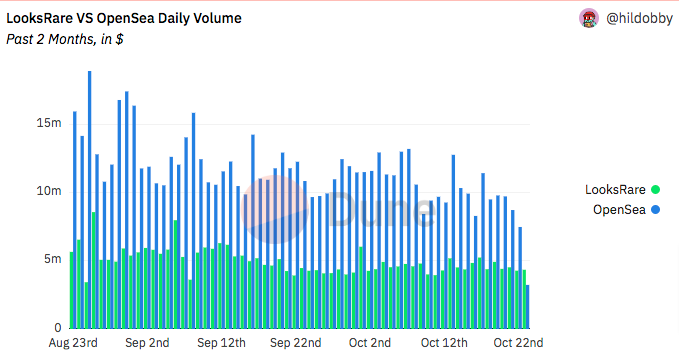 不幸的是,OpeaSea的市场份额从3月份的82%持续下降到8月份的35%左右。