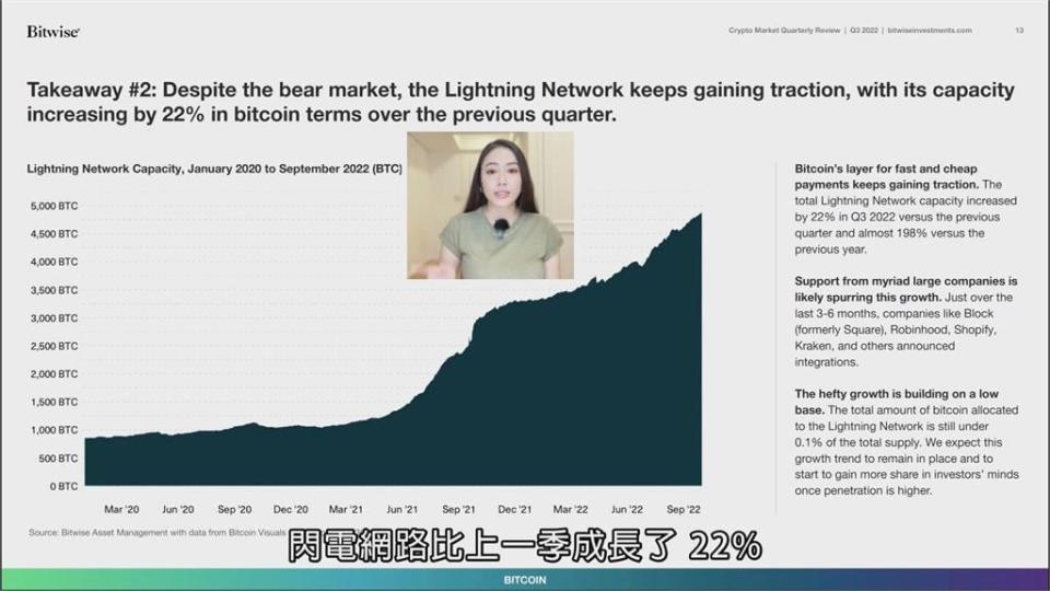邦妮接著表示,美元上涨,使得欧洲各国货币,都下跌百分之三到八,相较之下,比特币反而逆势上涨百分3.1,再来闪电网路表现特别好,以比特币计算,甚至比上季成长了百分之22,可说是逆势爆发,闪电网路虽受到很大关注,但目前分配到的比特币只有百分之0.1,还有很大的成长空间。