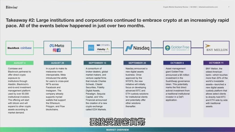 邦妮首先提到,2022年第三季对某些加密货币而言,是还不错的季度,并且透露美国证管会(SEC),已𫔭始认真讨论对加密资产的监管,9月份的加密报告更是有系统性的整理,一些大型企业,像是「Facebook」、「Nasdaq」、「GoldenTree」等,都加快脚步接受加密货币,但主导全球金融业的大公司,商业模式仍是采用𫔭发已久的技术,若要创新,答案就是Defi(去中心化金融),某些人认为若是Defi普及率提升,前景将是一片光明。