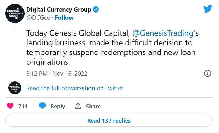 Genesis 母公司、创投业者 Digital Currency Group(DCG) 表示,由于 FTX 突然破产引发市场动盪,引发超出公司现行流动性的「不正常」提款要求,旗下贷款部门必须暂停赎回和新贷款申请,但 DCG 和其他全资子公司营运一切正常。