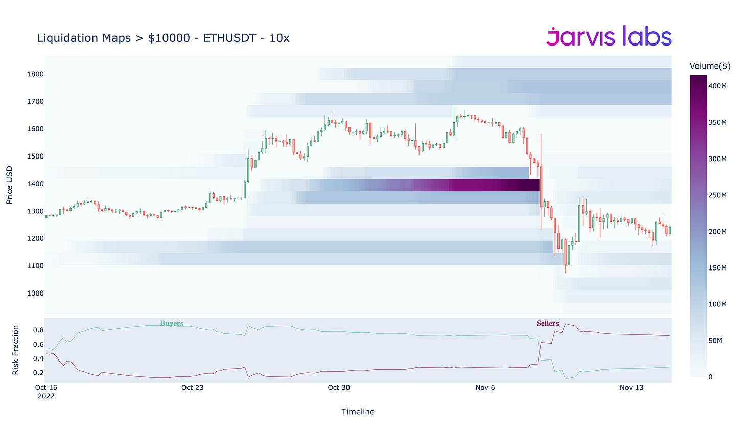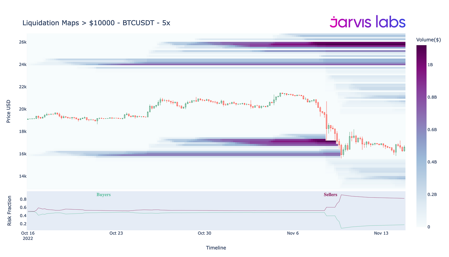 下图显示了BTC/USDT累计清算池,来自于用户在大于5倍杠杆的情况下交易价值超过1万美元的合约。