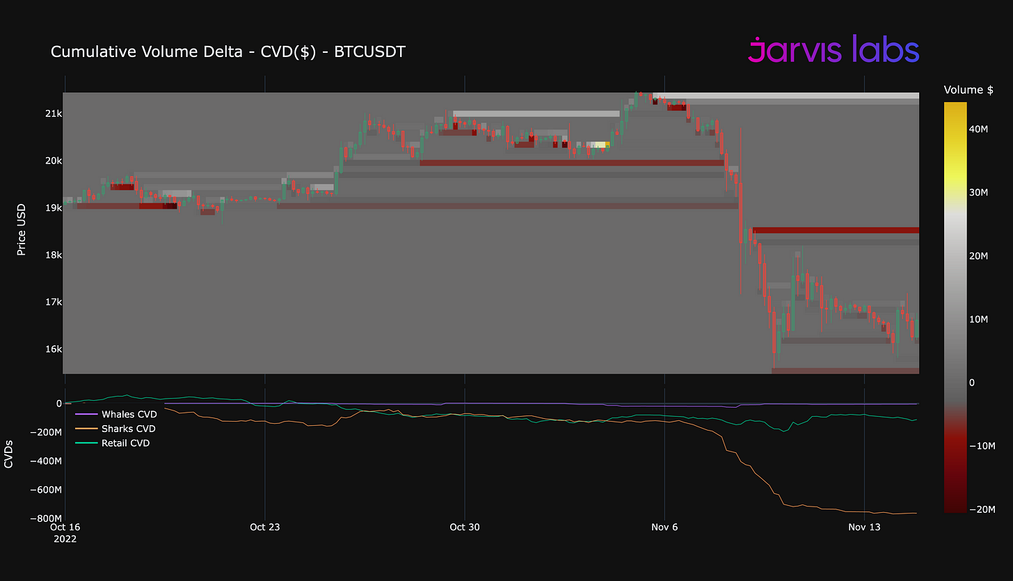 下图显示了比特币的总交易量增量(CVD),这让我们了解到哪类市场参与者正在购买和出售,以及在什么水平上购买和出售。