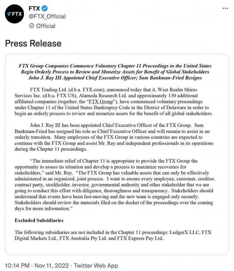 11月2日区块链媒体CoinDesk发文指出,FTX创办人山姆.班克曼-弗里德(Sam Bankman-Fried)旗下的Alameda Research主要资产其实是由FTX所发行的代币FTT,而全球最大交易所币安听闻后,决定将其所持有的FTT陆续卖出,引发FTT价格大跌,投资人也纷纷将资产从FTX提领。为了稳定FTT价格,FTX陆续表示资金充足,但仍无法停止投资者持续从FTX提出资产,最后造成挤兑。