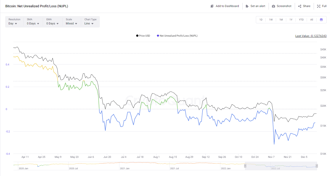 Chainalysis的数据涵盖了已实现损失,而链上分析平台CryptoQuant最近分享了FTX崩溃后比特币未实现净损失是如何被影响的数据。