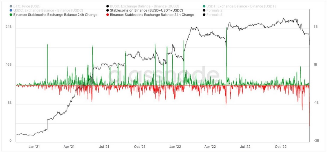 根据区块链情报平台Glassnode的数据,过去几天,稳定币从该交易平台大量流出,其中12月13日至14日的24小时内,BUSD、USDT和USDC流出了22亿美元。