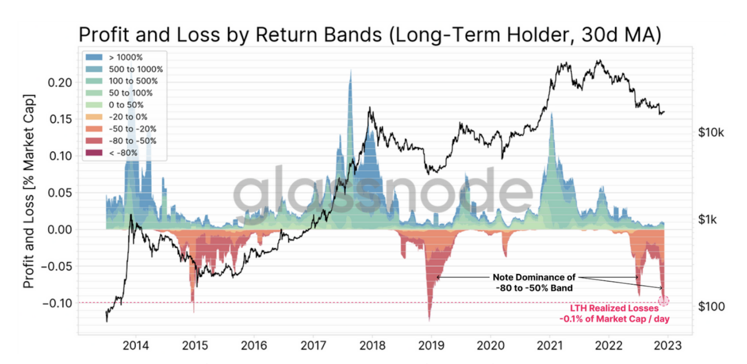 长期持有者的已实现损益指标跌至历史低点,表明可能出现超卖情况。长期持有者的已实现损失仅在2015年和2018年的底部达到过类似的水平。