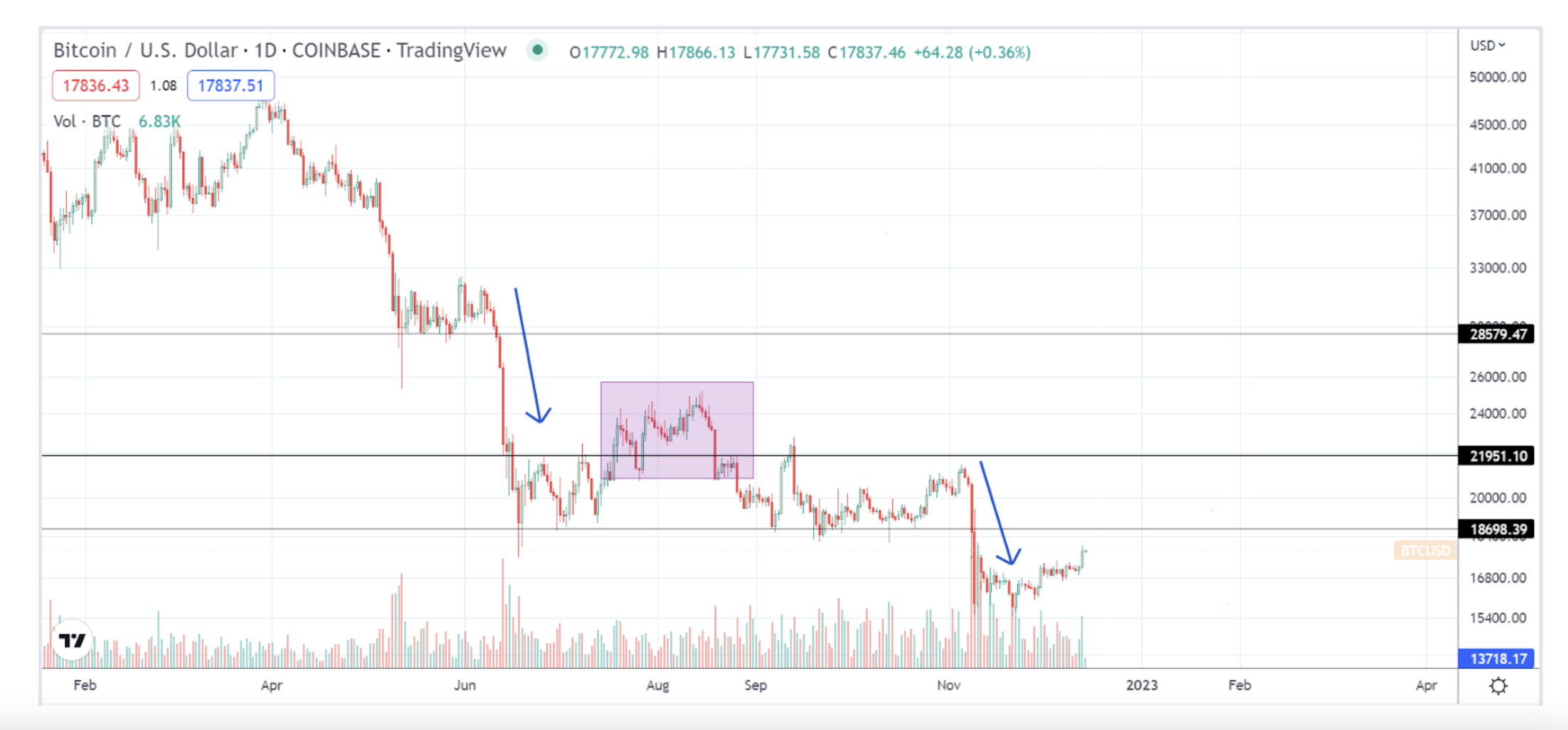 因此,短期熊市反弹可能会持续几天或几周,这正是7月至8月比特币价格飙升至25000美元时所发生的情况。根据11月的震荡水平和机构买入的迹象,比特币可能正在经历类似的熊市反弹。