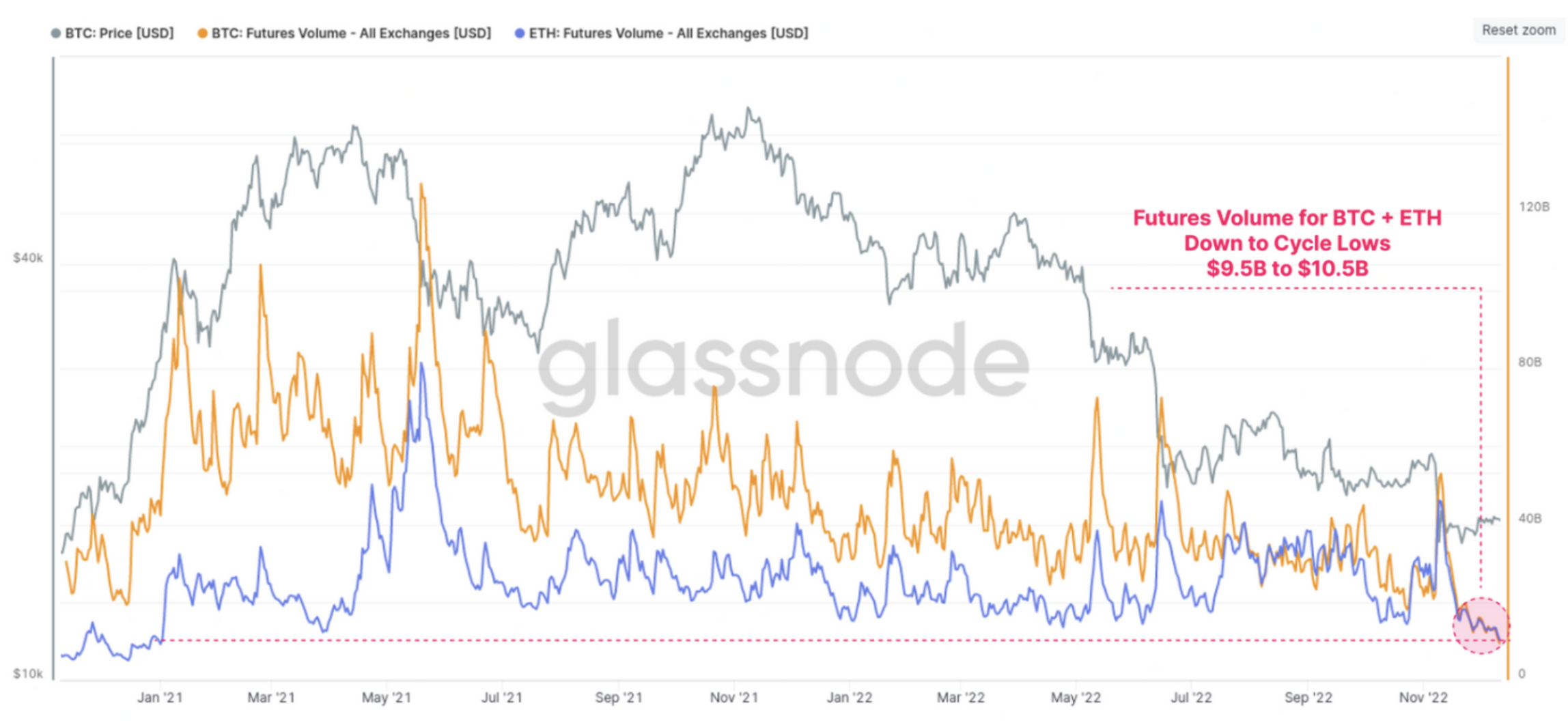 加密分析公司Glassnode报告称,比特币和以太坊的期货交易量“令人沮丧”,可以追溯到2021年前的水平,当时比特币的价格首次超过2万美元。