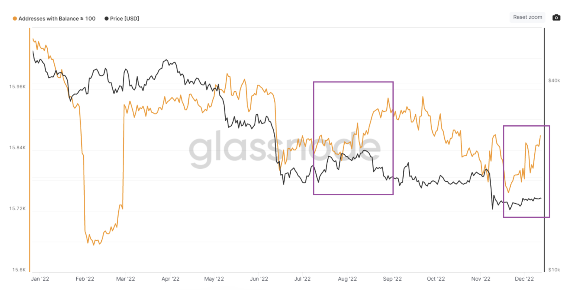 Glassnode的链上数据也显示了比特币鲸鱼的正积累,这些鲸鱼被确定为持有大于或等于100个这些鲸鱼BTC的地址。