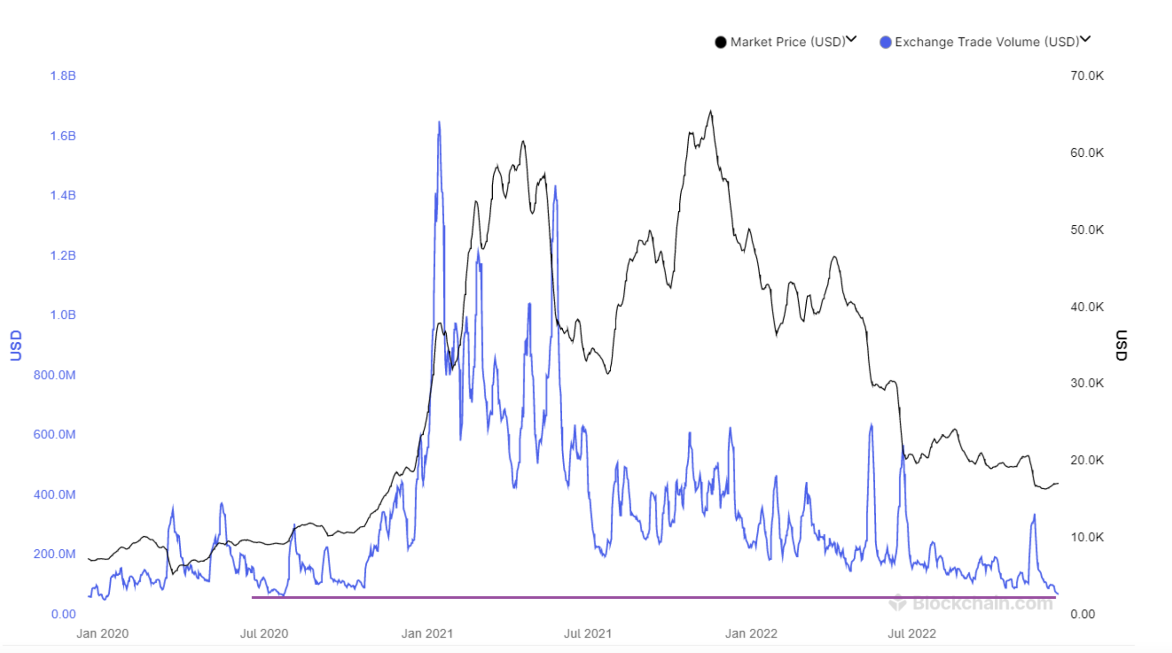 比特币在加密货币交易所的现货交易量也大幅下降,接近2020年的低点。Blockchain.com的数据显示,交易所交易量的七天移动平均值已降至6700万美元,而2021年牛市高峰期附近的交易量为14亿美元。