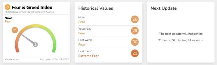 当前恐慌与贪婪指数:26(24 小时前爲 29),等级爲恐慌。