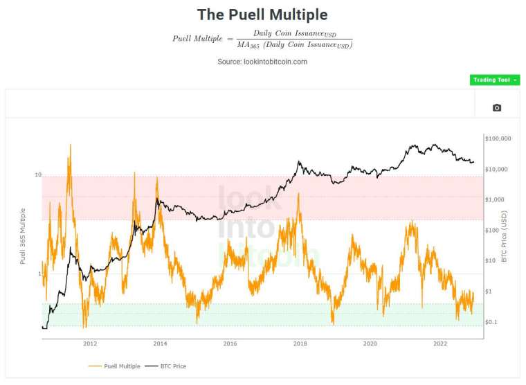 当前比特币 - 皮勒乘数 [Puell Multiple]: 0.53,白色区间 (详情见附图)