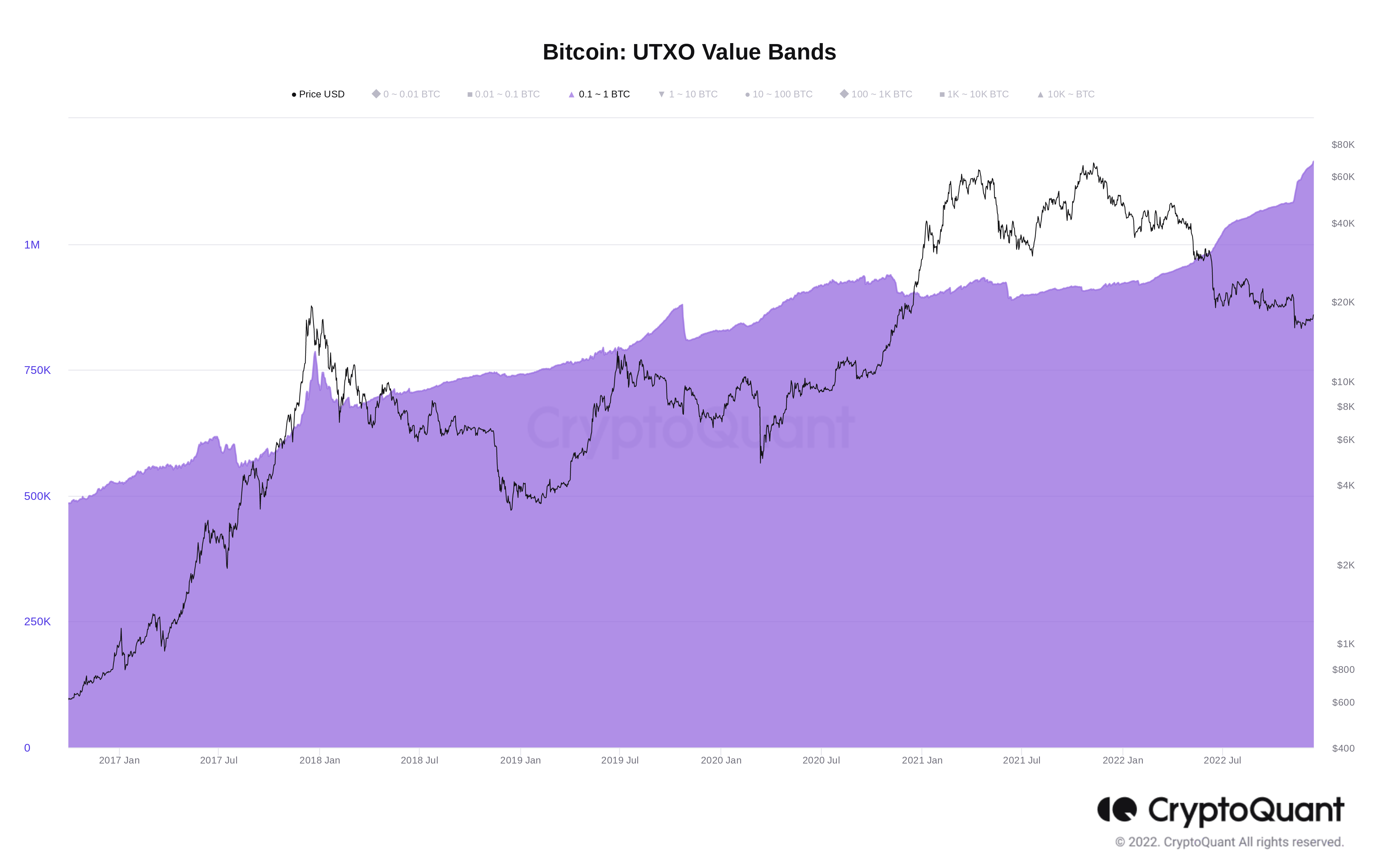 附带的图表显示了未花费交易输出(UTXO)价值的变化,价值在0.1 BTC和1 BTC之间的交易在第四季度明显增加。