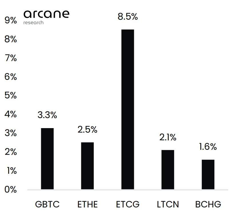 欠Gemini的债务可能会给DCG带来巨大的财务压力,因为他们可能会被迫出售大量的GBTC和ETHE头寸,以及由其姐妹公司灰度经营的信托基金的其他头寸。据Arcane Research称,DCG履行债务义务的另一条途径是启动Reg M分配,允许GBTC和ETHE头寸的持有者以1:1的比例赎回标的资产。