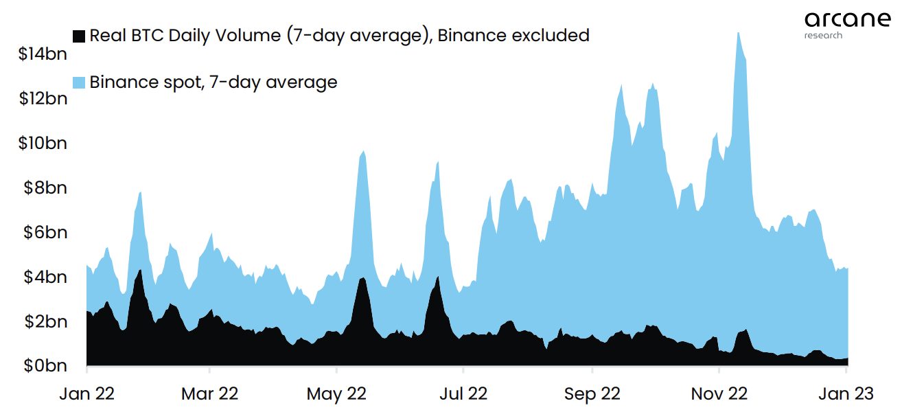 含Binance和不含Binance的比特币交易量 来源:Arcane Research