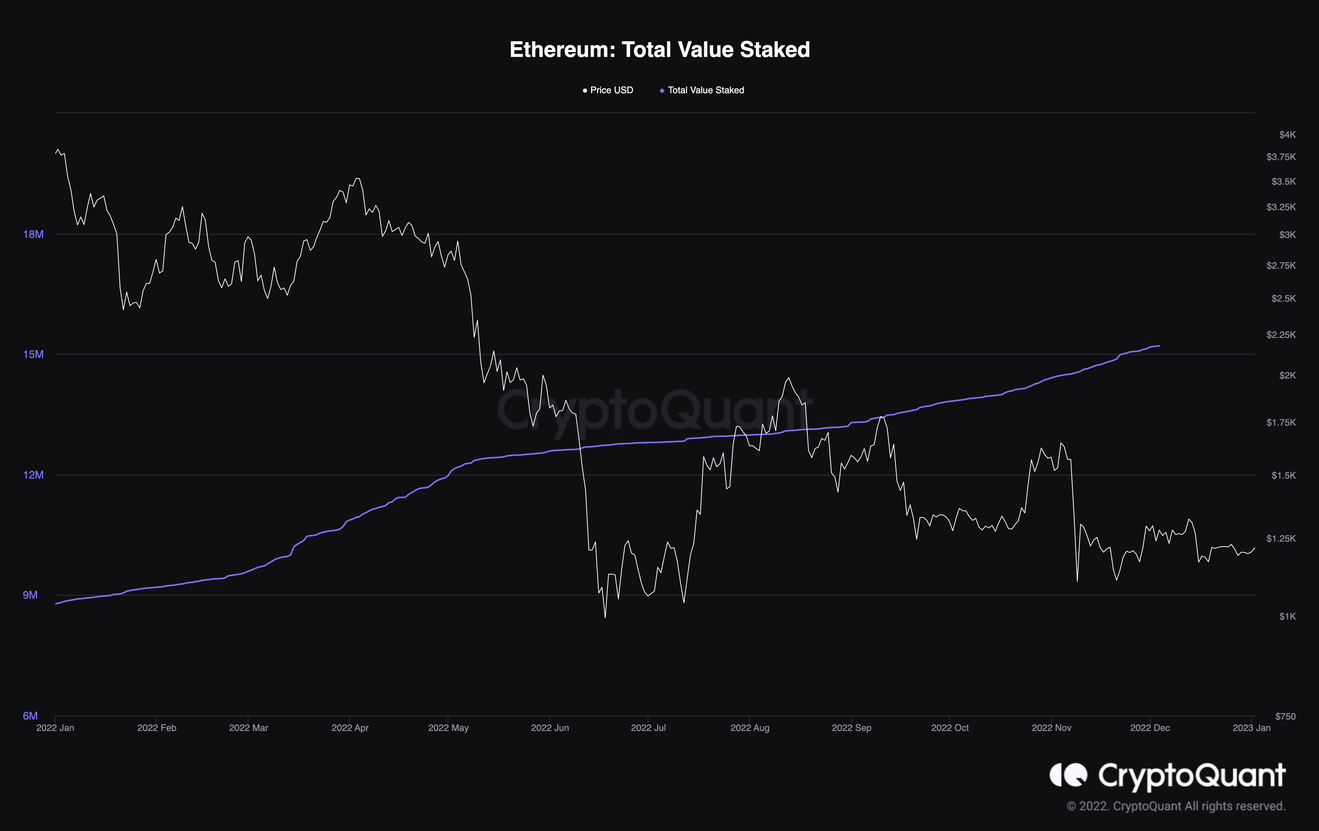 整个2022年,以太坊生态系统中锁定的以太坊总量持续稳步攀升。在2月至6月期间,被质押的ETH数量从略高于900万增加到近1300万。如下图所示,这一趋势在6月至9月之间趋于平稳,但在9月中旬左右再次聚集势头,也就是在以太坊备受期待的向权益证明过渡之前。