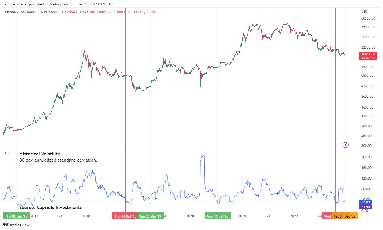 价格指标显示,BTC/USD目前正在经历历史上波动最小的情况。