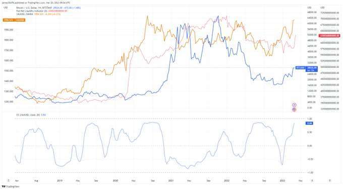 从历史上看,当比特币与黄金的联繫提高时,通常人们对它做为价值储存工具的信心增强,也帮助其价格走高。从 2021 年 6 月到 2022 年 2 月,两者相关性很强,但自 3 月之后𫔭始走弱。