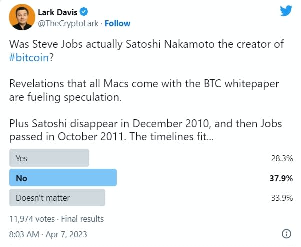 知名比特币投资人Lark Davis表示,「其实贾伯斯就是中本聪?」、「中本聪在2010年消失无踪、贾伯斯2011年逝世,时间上似乎对得上」,也让网友投票猜测中本聪倒底是不是贾伯斯,「28.3%的人认为是、37.9%认为不是、33.9%认为不重要」。也有网友认为这只是苹果工程师加入程式裡的彩蛋而已。