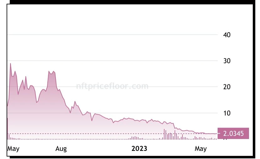 Moonbirds 的起步非常有前景,上万人报名参加了他们的预售,发售价格是 2.5 ETH,其创始人 Kevin Rose 更被誉为“NFT 教主”,接着几天和几周内,底价飙升至 40 ETH (按当时价值 约为 12 万美元),而从那以后,底价下跌了超过 95% 。比其他任何同期的所有蓝筹 NFT 项目跌幅都大。
