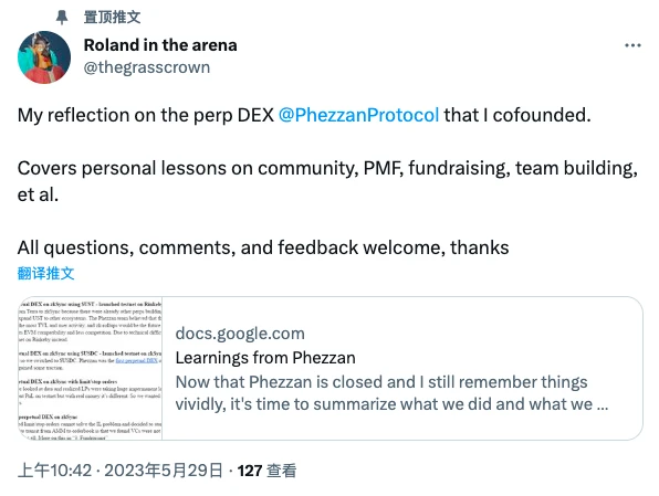 5 月 29 日, Phezzan Protocol 创始人 Roland 在个人推特上发布了一篇 文章 ,文中反思了自己在 Phezzan Protocol 的失败 中所得出的经验与教训,内容涵盖了融资、团队构建、社区运营等多个方面,对于同样正在 Web3 领域耕耘的创业者们来说,或许能够起到一定的启示作用。