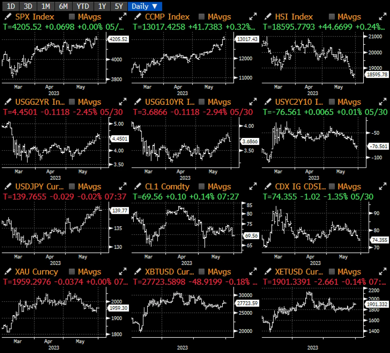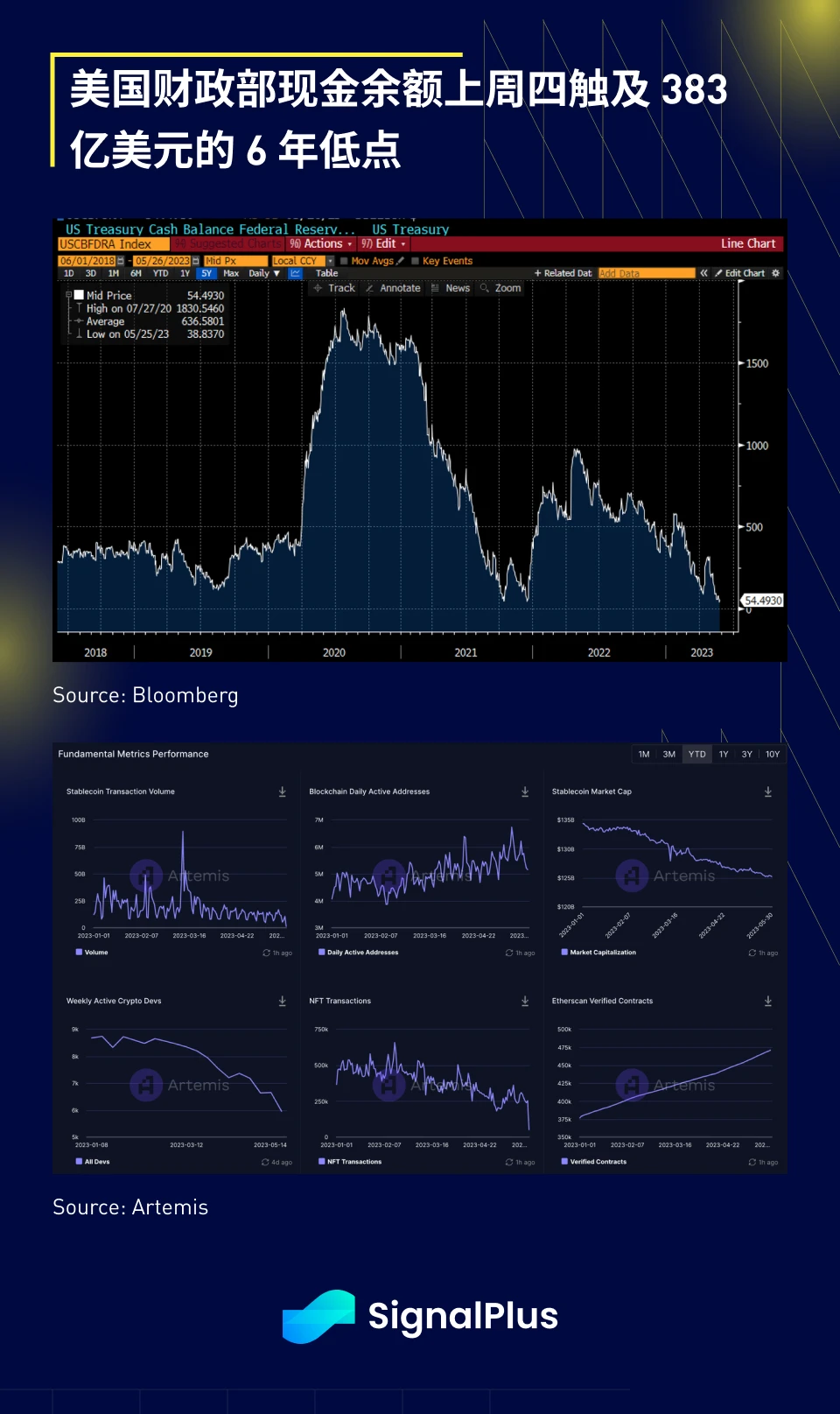 债务上限事件还未完全平息, 今天美东时间晚些时候众议院将对此进行投票,然后在下周一可能的 X-date 期限前送入由民主党控制的参议院 ;与所有肥皂剧一样,虽然市场基本上已经认定这个协议的通过是板上钉钉的事,因为没有人想成为美国政府停摆的罪魁祸首,不过某些共和党派系 (例如自由核心小组) 总是在最后一刻提出异议,他们实际上呼吁众议院议长 McCarthy 下台;上周五,美国的现金储备从前一天的 383 亿美元增至 545 亿美元,就算本周稍后的投票未能通过 (虽然不太可能),也提供了一点喘息的空间。