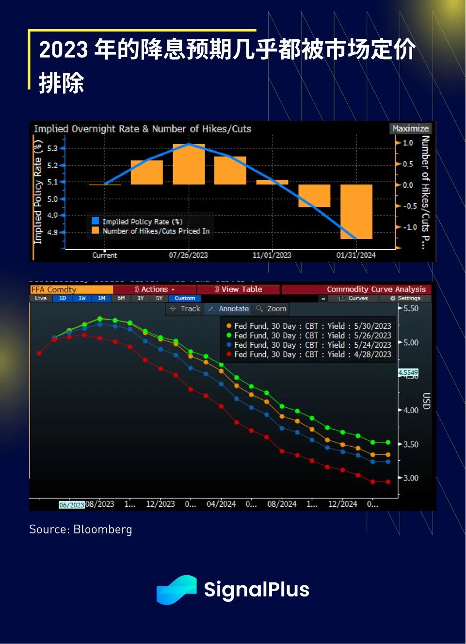 由于经济数据较为温和,加上美国违约危机(预期)将不会发生,美债收益率下跌约 10 个基点;然而, 市场已经排除了大部分 2023 年的隐含降息预期,市场定价显示有 90% 以上机率会在 6 月或 7 月再次加息 25 个基点 。