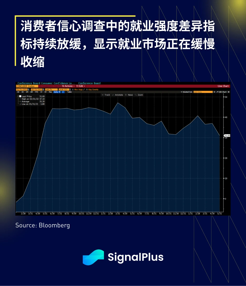 美国 5 月份消费者信心指数小幅下滑至 102.3 ,较 4 月份下降 1.4 个百分点, 主要是受现况指数和就业强度差异 ( 31) 下降的影响 ,后者降至 2021 年 4 月以来的最低水平,为周五的非农就业数据构建了更为温和的前景预期;达拉斯联储制造业指数紧随其后, 5 月份进一步下滑 5.7 点至 -29.1 ,其中大多数项目都下跌,陷入收缩区域,不过就业指数升至 9.6 显现出一线希望;美国房地产数据则较为乐观,美国 FHFA 房价指数连续第 3 个月上涨,S&P CoreLogic 房价指数也结束连续 7 个月的跌势, 3 月份上涨 1.5% 。