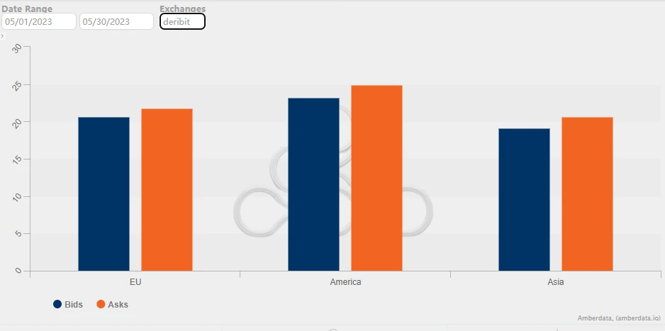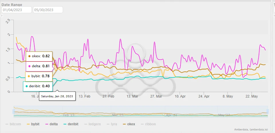 从盘口的偏离度来看,卖方在亚盘和欧盘的优势更大,均为 5% ,美洲则只有 3 – 4% ,甚至在部分日期出现了打平的局面。所以整个市场存在跨所针对超卖仓位进行套利的机会。初步判断这应该是最近 1 年销售较好的结构化理财产品造成的持续卖方优势的局面。