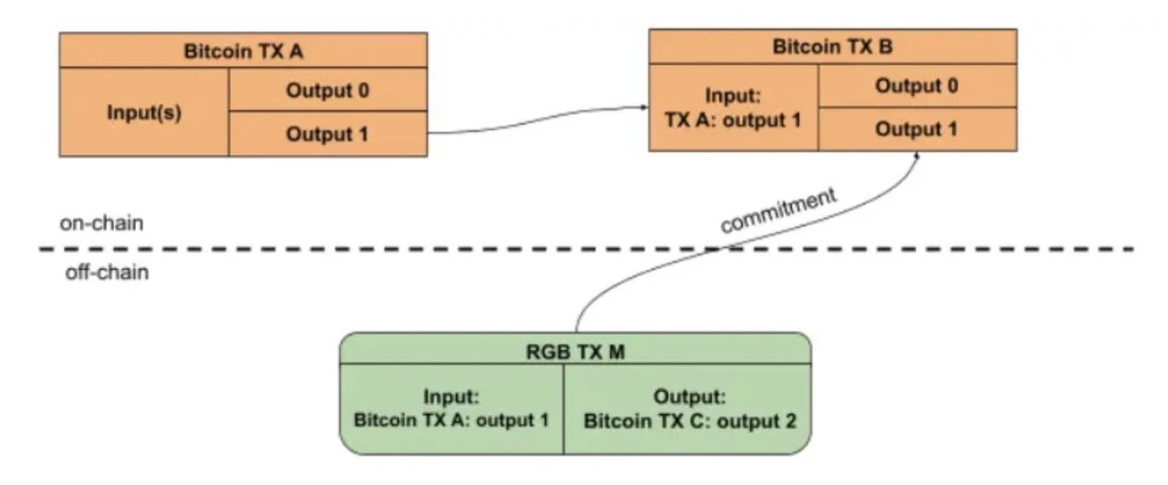 要转移这些代币你就需要创建一笔 RGB 交易以及一笔花费 UTXO 的比特币交易,并且这笔比特币交易承诺了 RGB 交易。