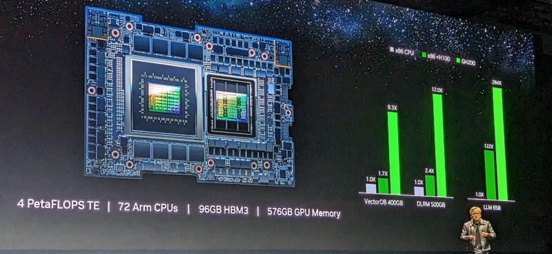 7. Nvidia的GH200 Grace Hopper现已全面投产。这款超级芯片拥有4 PetaFIOPS TE的性能,由72个Arm CPU通过芯片间连接进行连接,搭配96GB的HBM3和576GB的GPU内存。黄仁勋将其描述为世界上第一款既具备巨大内存又具备加速计算功能的处理器:“这是一台计算机,而不仅仅是一颗芯片。”它专为高弹性的数据中心应用而设计。