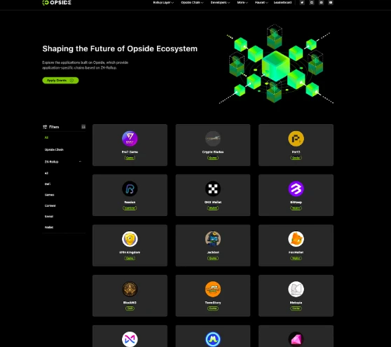 一键生成 ZKRollup 是 Opside 技术上的重要创新之一,项目方可以通过 Opside 官网上的 ZKRollup launchpad 一键生成属于自己的 ZKRollup 链,同时包括一键部署智能合约,生成桥和浏览器等。Pre-alpha 测试网期间,开发者或项目方仅需 10 分钟左右便能生成 ZKRollup 链、桥和浏览器等一系列配套设施,后续 Opside 也将不断优化,未来有望在五分钟之内实现整个过程。截至目前,Opside 已经和 25+ 优质的生态项目达成合作,大部分项目方正在紧锣密鼓的部署中,不久用户就能与生态内更多的 DAPP 进行交互。