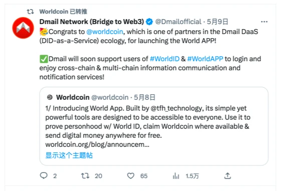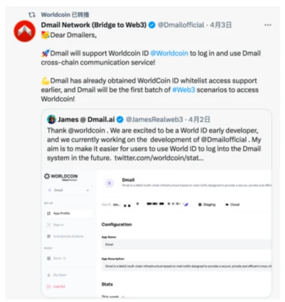 图注:WorldCoin 官推与 Dmail 互动频繁