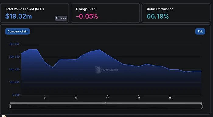 TVL - 目前 Sui 的链上 TVL 为$ 19.02 m,过去一个月中的峰值为$ 36 m。