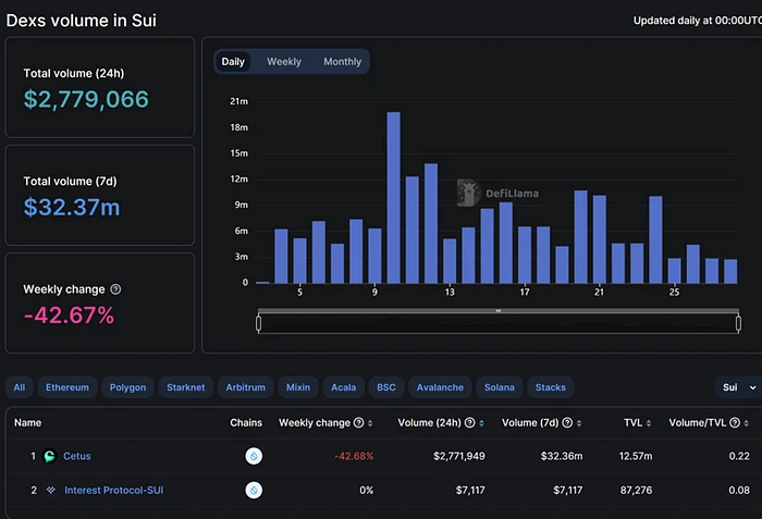 交易量 - 目前 Sui 的 7 日交易量至少为$ 32.37 m, 位列所有链第 20 位。主要链上交易额发生于 Cetus。