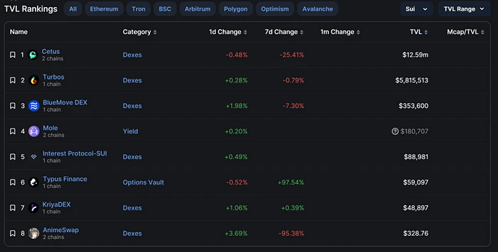 Cetus 是 Sui 上 DeFi 生态,乃至整个 Sui 生态链上数据的中流砥柱。不论 TVL 还是交易量,都几乎占据绝对主导地位。但是这样的状态对于 Sui 整个链来说并不是健康的。