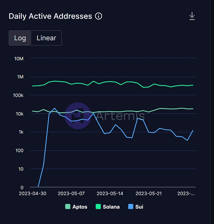 如果采用 Artemis 的统计方法,即 24 小时发生交易的独特钱包数,并对比同为非 EVM 链的 Solana 和 Aptos,则数值更低: