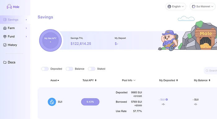 Mole 是一个基于 Sui 以及 Aptos 的收益聚合器,支持单币和双币两种机枪池模式,同时拥有类似 BNB Chain 上 Alpaca 的杠杆挖矿功能。目前 TVL 为$ 18 万。