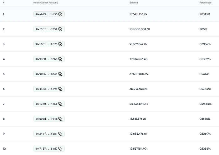 究其原因,我们通过观察当前$Sui 持仓数据可以得知, 几乎全部的流通量(可能包括大多数的$Sui 节点质押奖励)目前都处于非质押状态。其中最大的几个 holder 我们推测为中心化交易所(估计占比在 4% 以上)。也就是说仅有非常少部分的$Sui 用于链上活动。