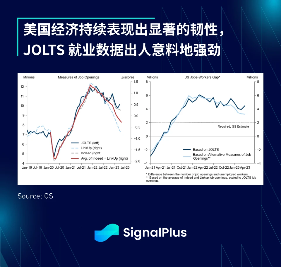 最出乎意料的数据结果是 JOLTS,相较于预期的 940 万,职位空缺数高达 1, 010 万,超过 4 个标准差,同时也上修了前值,辞职率也从前几个月的 2.5% -2.6% 下滑至 2.4% ,而 Powell 偏爱的“职位与失业人数”比率也回升至 1.8 倍,与其他疲软的就业数据形成对比。