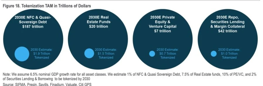 花旗最近发布的一份研报预测, 到 2030 年,将有 4 万亿至 5 万亿美元的代币化数字证券,基于分布式账本技术的贸易金融交易额也将达到 1 万亿美元。该激进预测基于以下假设: