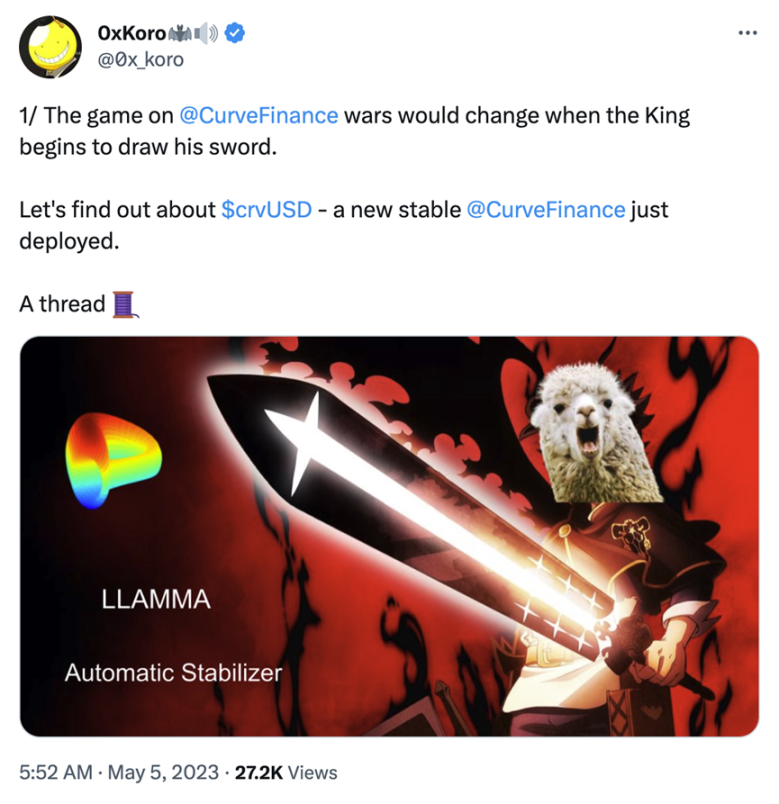 就像用户可以使用 Maker 用他们的 ETH 铸造 DAI 一样,Curve 用户可以用 Curve 上的资产 ( 如 ETH 及其衍生品 ) 很快铸造 crvUSD。通过新的贷款清算 AMM 算法 (LLAMMA), Curve 打算改进 DAI 久经考验的债务抵押头寸 (CDP =“贷款”) 稳定币设计。