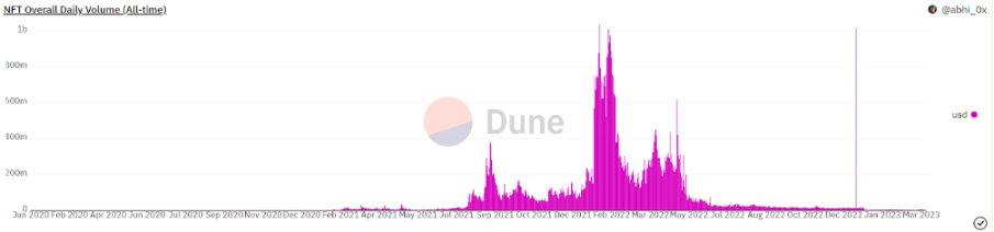 在广义的 NFTFi 领域,NFT 交易市场仍然是占据最多资金与关注度的赛道,NFT 目前主要的交易平台包括 Opensea、LooksRare,X2Y2,聚合器 Gem、Blur、Element,去中心化交易平台 Sudoswap 等。2022 年初,NFT 市场延续了 2021 年的火热态势, 1 月份市场成交量突破 50 亿美元,再创历史新高,虽然 2022 年整体较 2021 年同比交易量显著下滑,但是这一年 NFT 交易市场也陆续发生了一些重磅的事件,X2Y2 宣布 0 版税,首个支持 AMM 的 NFT 交易市场 Sudoswap、为专业 Trader 打造的 Blur 发布空投代币等,使得整个 NFT 交易市场的格局发生了天翻地覆的变化,在诸多 NFT 市场中,最受瞩目的新秀毫无疑问是聚合交易市场 Blur。