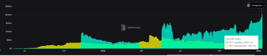 DefiLlama 数据显示,自 2022 年 6 月份以来,相比于日渐萎靡的 NFT Market,NFT lending 量一直在稳定上升,借贷是 NFTFi 最重要也是产品最多的赛道,这一定程度上表现了 NFTFi 领域获得了更多资金的关注。