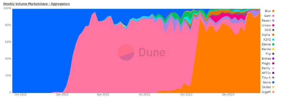 从图中我们可以很明显的看到主流交易市场的份额变化,Blur 从 2022 年 10 月份正式启动以来,公测 3 天后便迅速超越 Gem,迅速占据了整个聚合交易市场交易量的 80% , 11.27 日,Blur 以 5500 ETH 的交易量超越了 Opensea 的 5300 ETH,成为了交易市场中当之无愧的黑马,牢牢占据了主导地位。