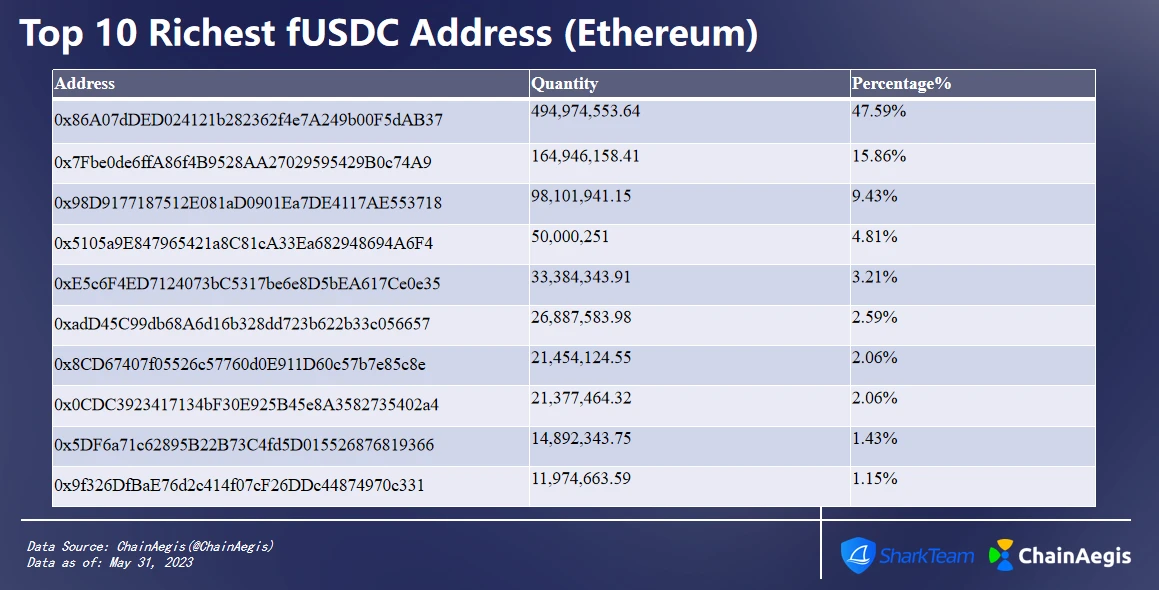 SharkTeam 对以太坊上 fUSDC Top 10 持币者进行统计如下,其中 top 3 地址持币总量占比 72.88% 。