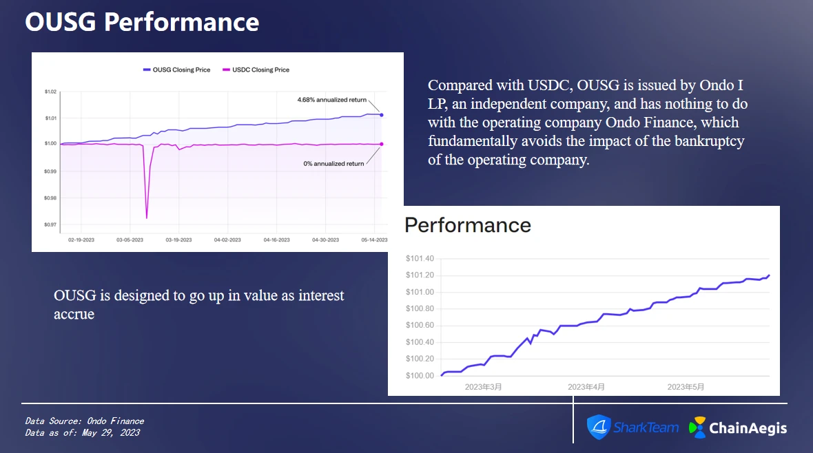 作为国债基金的 OUSG 旨在随着利息的增加而升值 ,截止到 5 月 29 日,其代币价格为 $ 96.83 。