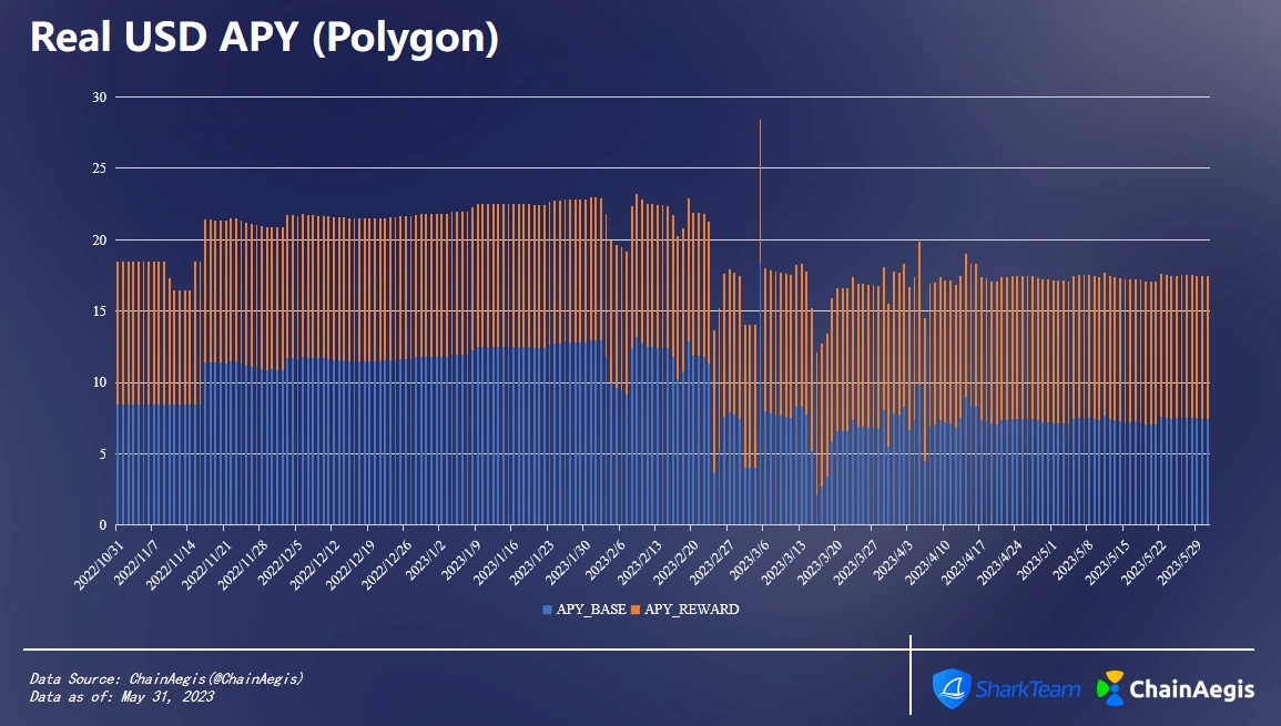 下图为 USDR 在 Polygon 链上的 APY 变化情况。年利率( Annual Percentage Yield , APY )指的是一年复利(利息 + 本金)所赚取的金额。可以看到,当前 APY 较上线初期总体变化不大,略有下降趋势,下降了 5.78% 。