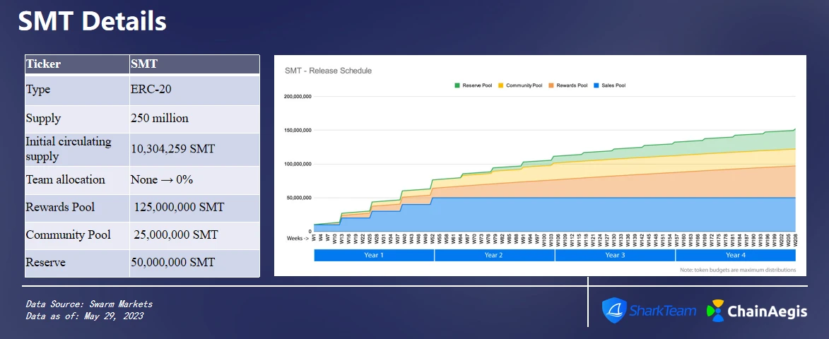 SMT 供应总量为 2.5 亿,其中 50% 分配给奖励池, 10% 分配给社区池, 20% 留作将来使用,预期 5 年线性释放。