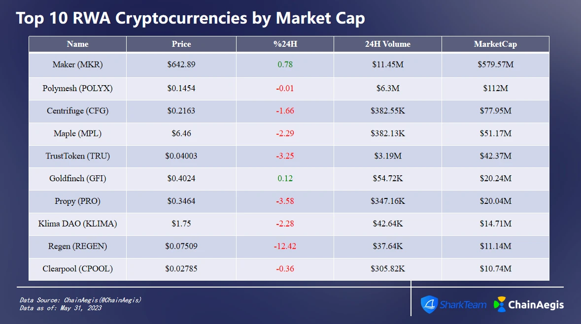 Maker DAO 发行的 $MKR 是目前最大 RWA 代币, 24 小时交易量为 11.45 M ;受监管的机构级 Layer 1 区块链 Polymesh 发行的 $POLYX 排名第二, 24 小时交易量为 6.3 M 。排名第三为信贷协议 Centrifuge 发行的 $CFE , 24 小时交易量为 382.55 K 。